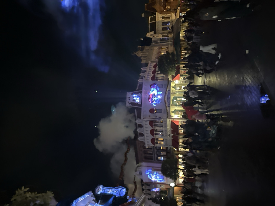 The image depicts an evening scene on Main Street U.S.A. in Disneyland Paris, located in Chessy, France. A large crowd of park guests, estimated to be over a hundred individuals, occupies the wet, dark-paved street in the foreground and midground. Most individuals are in casual attire, some walking and others standing, with their faces largely indistinct due to low light and distance. In the background, a row of multi-story buildings, characteristic of late 19th/early 20th-century American architecture, line the street. These buildings feature numerous windows, balconies, and red awnings over storefronts. Several buildings are illuminated by warm interior lights and exterior decorative lighting. White, billowy smoke or fog emanates from behind the left-most buildings, near a prominent vertical sign that reads "WALT'S." Projections of blue, luminous patterns and figures are cast upon the facades of the central buildings, including one above a sign identifying "DELICATESSEN." The sky above is dark, with some lighter blue areas and wispy clouds visible towards the right, suggesting atmospheric lighting effects. Reflections of lights and figures are visible on the wet street surface. Decorative garlands are strung across some building fronts.