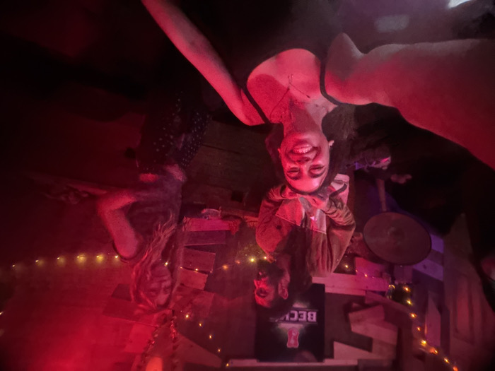 Three people smile in an upside-down dimly lit photo. A woman in a black top and necklace is central, with a hand near her face. A person in a brown jacket is below her. To the left, another woman with long hair stands. Decorations of lights and wood make a backdrop. A black sign with “Beck’s” printed on it is visible. The lighting has a strong red hue. A drum is visible on the right.
