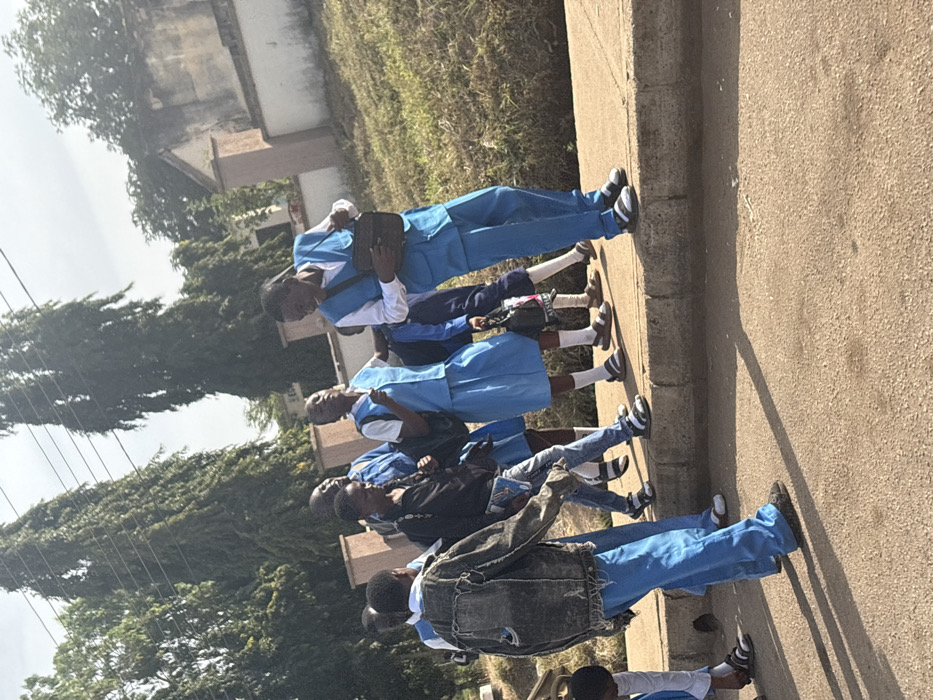 A group of approximately eight young individuals is depicted outdoors, walking on and alongside a paved road with a raised concrete sidewalk in what is identified as Rafin Par, Nigeria