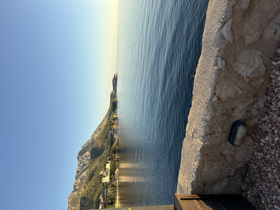 The image displays a panoramic coastal scene in Kamenovo, Montenegro. In the immediate foreground, a textured stone retaining wall spans horizontally, featuring an embedded dark oval-shaped outdoor light fixture to the left of center. The ground below the wall is covered with light-colored gravel, and a partial dark brown rectangular object is visible on the far left. The midground is dominated by calm, dark blue-green sea water exhibiting horizontal ripples. The coastline curves from the left to the right, revealing multiple white buildings with red roofs nestled among dense green vegetation on the lower slopes of the mountains. The background consists of rugged mountains, covered in green foliage and exposed grey rock formations, rising steeply from the coast. The sky is clear blue, gradually lightening to a yellow-white hue near the sea horizon. A faint white aircraft contrail is visible in the upper left sky. No individuals or active interactions are depicted within the scene.