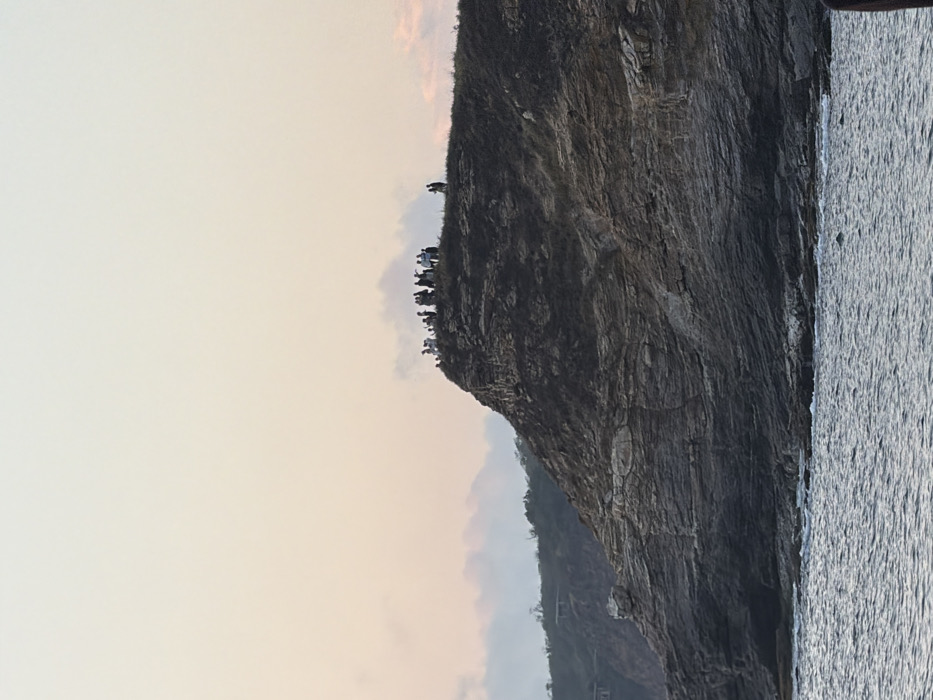 A tall, craggy cliff dominates the scene, its face marked with dark striations and geological formations. The cliff plunges down to the ocean waters, reflecting a gray, textured surface. At the cliff's summit, a group of people are visible, seemingly observing the landscape. The sky is pale with a gentle gradient of colors.