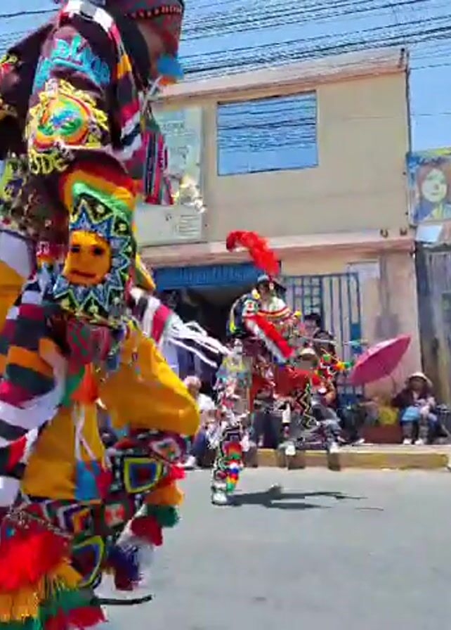 A street parade on a sunny day shows performers in colorful costumes dancing. One performer in the foreground wears an elaborately decorated outfit with a rainbow hat, striped sleeves and legs, and numerous tassels. This person is moving energetically, followed by others similarly dressed but with slightly different colors and patterns. Spectators line the side of the road, some sitting on the curb. Buildings can be seen in the background, and a sign for “EL PAYASO FITO EL” is visible on one of the buildings. Overhead, utility wires crisscross the sky.