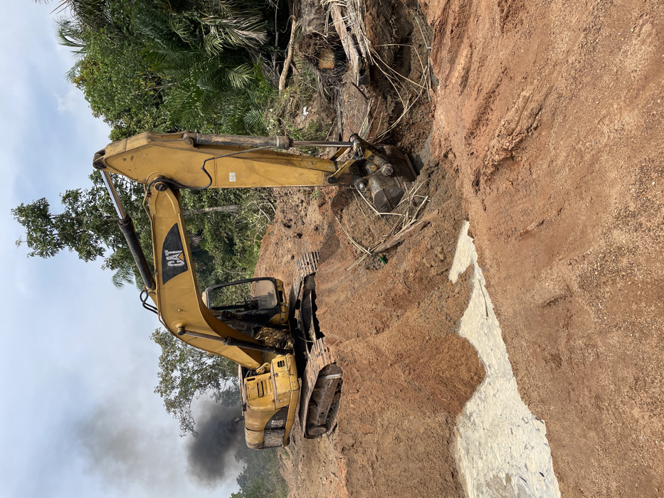 A yellow Caterpillar excavator is positioned on a construction site. The excavator's arm extends to the right, with its bucket digging into the earth. The ground is a reddish-brown, indicating soil. To the left and above the excavator, dense green trees and vegetation are visible, suggesting a natural or forested area. Smoke is billowing from the bottom left corner of the excavator, possibly indicating it is running or experiencing some operational process.