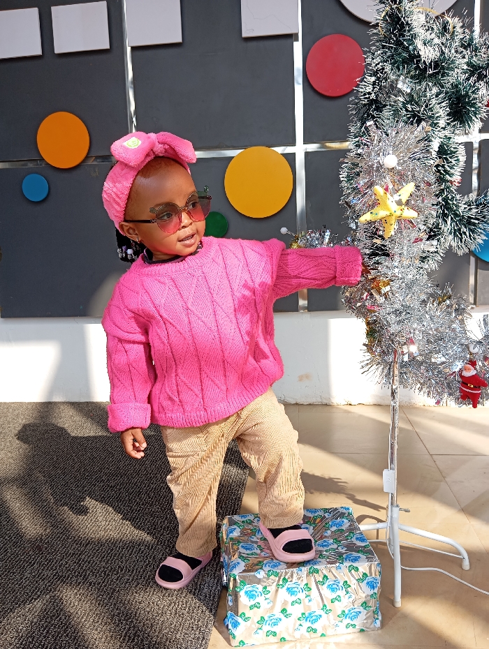 A young child, likely female, of African ethnicity, is captured in a full-body, eye-level photograph, standing indoors or in a sheltered outdoor area. She wears a hot pink cable-knit sweater, light tan corduroy pants, and pink and black slide sandals. Her head is adorned with a pink headband featuring ear-like protrusions and pink-tinted, heart-shaped sunglasses. A dark necklace or choker is visible. The child's left foot rests on a square gift box wrapped in reflective silver paper with a blue floral pattern. Her right foot is placed on the lighter floor surface beside it. Her right arm is extended, hand reaching towards a small, artificial Christmas tree positioned to her right. The tree, standing on a white metal base, is heavily decorated with silver and some green tinsel garland, featuring a yellow star ornament and a small red Santa Claus figure. The background consists of a dark grey wall embellished with various geometric shapes in orange, red, white, and light blue. The floor transitions from a dark grey textured mat on the left to a lighter-toned, possibly tiled, surface. Strong illumination, suggesting natural sunlight, creates distinct shadows on the floor, including a partial shadow of an individual or object out of frame to the left. The precise location within Jos, Nigeria, is not discernible from the visual information in the image.