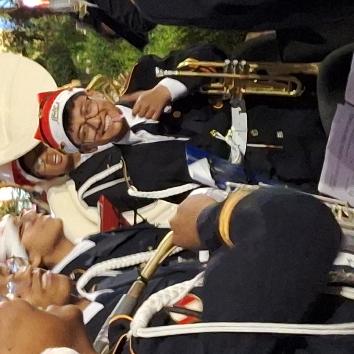 A group of people are gathered, seemingly involved in a parade or performance. They are wearing navy blue uniforms with white accents and some festive Santa hats. One person is prominently smiling at the camera while holding a trumpet, giving a thumbs-up. Another person is partially visible, also wearing a Santa hat and smiling. The scene is a bit blurry with a slightly chaotic feel, possibly due to movement and lighting.