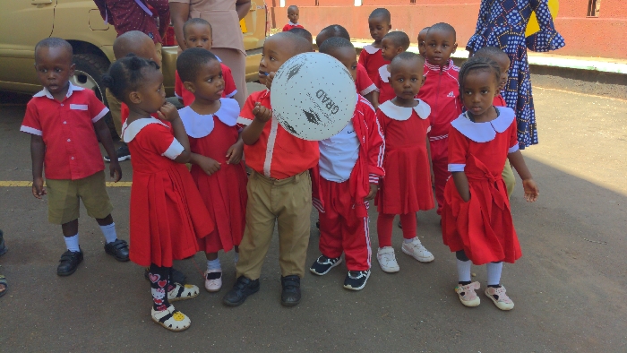 A group of children are gathered, mostly wearing red outfits with white collars. One child holds a white ball with "GRAD" printed on it. Some children wear red shirts and khaki pants. There is a vehicle partially visible in the background. An adult in blue and yellow patterned fabric stands at the edge of the group. The setting appears to be an outdoor area, possibly a school or event space.