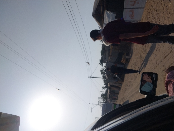 The image captures an outdoor daytime scene on an unpaved dirt road in Deir el-Balah, Palestinian Territory