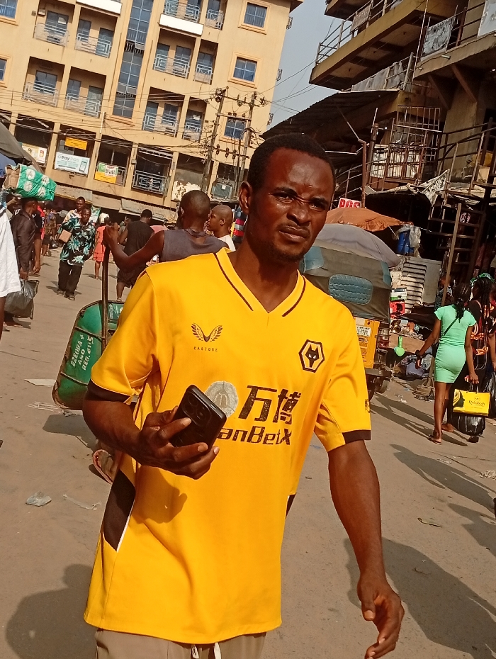 An outdoor scene in Fegge, Nigeria, depicts a busy street or market area under clear daylight. In the foreground, a Black male, approximately 30-40 years old, stands facing slightly towards the viewer with a neutral expression. He wears a yellow short-sleeved football jersey with black accents, featuring "CASTORE" on the right chest, a black hexagonal logo on the left chest, and "万博 ManBetX" centrally. He holds a black smartphone in his left hand, positioned below his waist. His right hand is open by his side. He wears light-colored trousers. In the mid-ground and background, multiple individuals are present, indicating a crowded environment. On the left, a person carries a large green bundle on their head, walking away from the camera. Other pedestrians are visible, including a person in a patterned shirt and a person in a light green dress carrying a yellow bag on the far right. A motorized tricycle (keke) with a blue cover is parked or moving in the mid-ground on the right. The environment features urban architecture. On the left, a multi-story building with a light brown facade and numerous windows is visible, displaying commercial signs on its lower levels. Electrical poles with a dense network of overhead wires run vertically in the mid-ground. On the right, another multi-story structure, appearing older and partially exposed, shows metal railings and potentially informal market setups at its base. The ground consists of an asphalt or dirt surface with scattered debris.