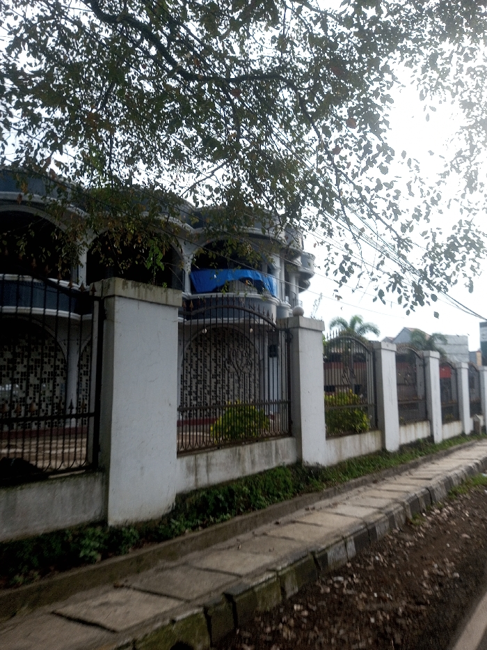 This image displays the exterior of a multi-story building in San Pya, Myanmar, observed from street level. The structure features a gray roof, a white facade with multiple arched openings, and decorative black wrought iron railings on its balconies. A blue tarp is draped over a section of an upper balcony towards the right side of the building. A white concrete fence with integrated black wrought iron panels and regularly spaced white pillars runs parallel to the viewer, separating the building property from the sidewalk. Low green vegetation grows along the base of this fence. The immediate foreground shows a concrete sidewalk composed of distinct rectangular panels, bordered by a curb and a strip of exposed dirt/soil to the right. Overhanging tree branches with green leaves partially obscure the upper portion of the building and the bright, overcast sky. No individuals are visible within the scene.