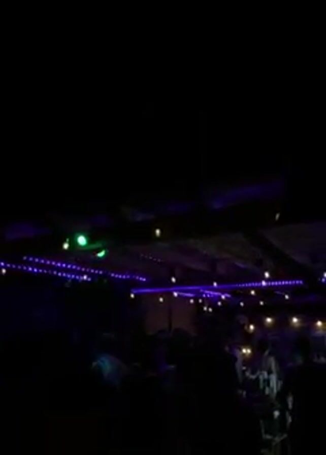 dimly lit outdoor bar or restaurant at night. The area is crowded with people, mostly silhouettes in the dark, suggesting a lively atmosphere. Overhead, the structure is decorated with strings of small incandescent lights and purple LED strip lights, creating a festive mood. There's at least one spotlight or colored light source among the purple, adding to the ambiance. Some of the people appear to be standing, possibly congregating near the bar or tables. The camera remains static, focusing on the overall scene.