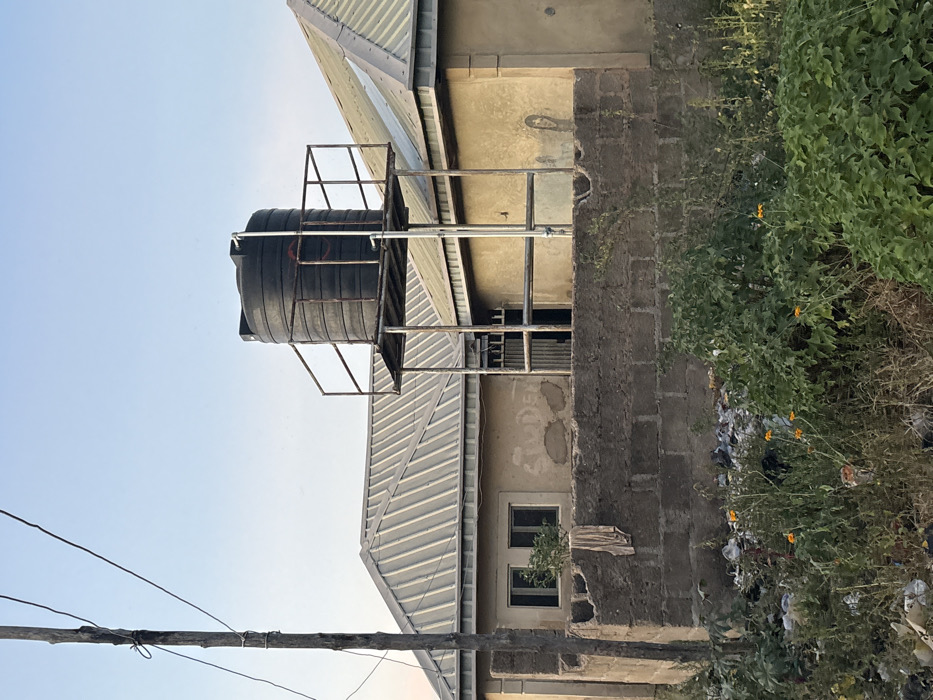 The image displays an outdoor urban environment in Jos, Nigeria, under a clear, light blue sky. A black, cylindrical plastic water tank is mounted on an elevated metal stand with railings, centrally positioned. A white PVC pipe is connected to the tank's top. Behind the stand, two single-story structures with light-colored corrugated metal roofs and beige walls are visible. The structure on the left features two rectangular windows, with faded text "STUDENT" partially legible on its wall. A metal gate is partially visible between the structures. In the foreground, a damaged, low concrete block wall extends horizontally, with a light-colored fabric draped over it. Dense green vegetation, interspersed with scattered orange flowers and various discarded refuse items, occupies the area in front of the wall. On the far left, a wooden utility pole with attached wires stands vertically. No individuals are present.