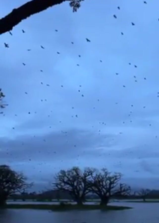 The video depicts a serene twilight scene of a lake dotted with small islands hosting trees. A large flock of birds is visible against a slightly overcast blue sky. The foreground features silhouetted tree branches framing the scene, emphasizing the perspective towards the open water and sky filled with birds. The water appears calm with gentle reflections, enhancing the tranquil atmosphere of the early evening.