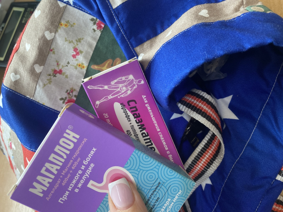 An indoor, close-up photograph taken in the city of Ol'khovskoye, Russia, depicts a human hand holding two pharmaceutical boxes over an open fabric bag. The hand, specifically the thumb and forefinger, exhibits a French manicure with pink nails and white tips, and holds a purple and light blue box labeled "МАГАПЛОН" (MAGAPLON), indicating "Алгелдрат + Магния гидроксид 400мг + 400мг" (Algeldrate + Magnesium Hydroxide 400mg + 400mg) for "изжоге и болях в желудке" (heartburn and stomach pain), with a stomach graphic and text about sugar-free, mint-flavored chewable tablets. Resting beneath and behind this box is a partially visible magenta box labeled "СПАЗМАМЕН" (SPAZMAMEN), with a white outline of a human figure and text referencing "питофенон + нафофубун 400" (pitofenone + nafofobun 400) and "для уменьшения спазмов и болей" (for reducing spasms and pain). The fabric bag features a patchwork exterior with blue sections containing white stars, beige sections with white hearts, and floral patterns (red/pink flowers on beige). Its interior lining is solid royal blue. Inside the bag, a striped fabric strap (white, black, red) is visible, along with a blurred, clear plastic-wrapped object. The background is indistinct, suggesting a flat surface.