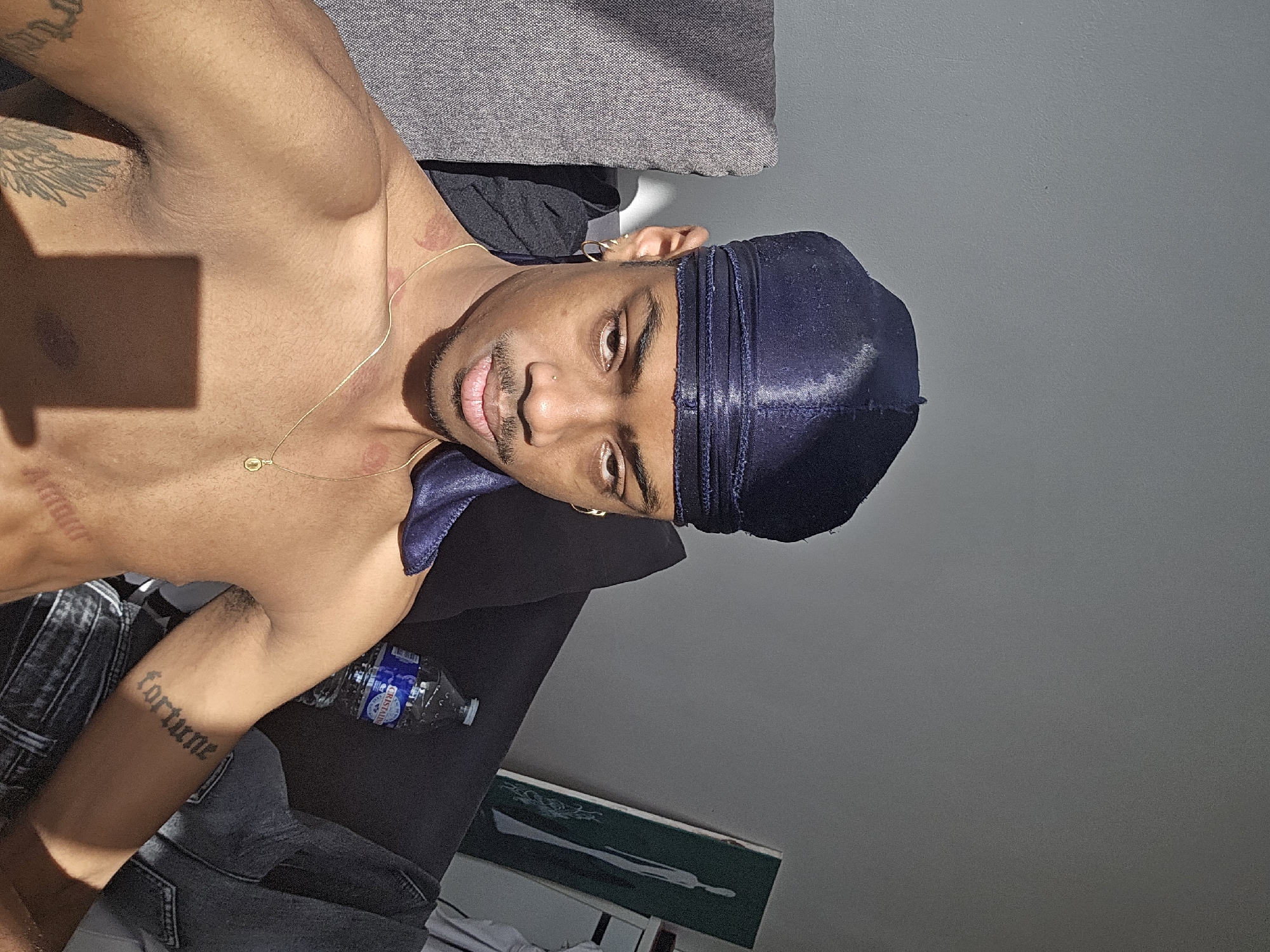 This image, taken in Pantin, France, presents an adult male of dark complexion, captured from the mid-chest upward in an indoor setting. He wears a shiny navy-blue durag and is shirtless. A thin gold chain with a small, round pendant adorns his neck, complemented by golden hoop earrings in both ears and a silver nose stud in his left nostril. Visible facial hair includes a faint mustache and chin stubble. Multiple red-purple marks, consistent with hickeys, are present on his neck, left clavicle, and upper chest. Tattoos include a winged design on his left inner bicep/upper arm and the word "fortune" in Gothic script on his right forearm. A faint mark or scar, possibly reading "Amour", is discernable on his lower chest. A rectangular shadow is cast across his chest and abdomen, indicative of a photographic device. The subject is positioned against or next to dark grey upholstery, with a light grey textured cushion visible to the left. In the background to the right, a partially consumed clear plastic bottle of Cristaline mineral water rests on a dark surface. A vertical dark green canvas artwork, featuring a slender, light-colored abstract human figure, leans against a light grey wall. The scene is illuminated by strong directional light, creating distinct shadows.