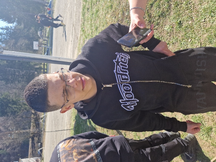 The image depicts an outdoor scene in Troyan, Bulgaria, on a bright, sunny day. The central figure is a young male with short dark hair and rectangular eyeglasses, wearing a black full-zip hoodie with "Hoodrich" embroidered in white on the chest, and black sweatpants displaying "VANQUISH" faintly on the right thigh. His right hand is partially in his pocket, and he is looking slightly downwards and to his right. A hand, likely belonging to someone off-camera, is visible on the right side of the frame, holding a black smartphone towards the central figure; this hand wears a silver-colored bracelet. To the left of the central figure, a second individual is partially visible, wearing a dark long-sleeved shirt with a large graphic design on the back, dark pants, and dark sneakers. In the mid-ground, an outdoor basketball court with a white backboard and hoop is visible. On this court, two additional males, both dressed in dark clothing, are walking in opposite directions. The background consists of green grass, numerous tall coniferous trees, and a light-colored building structure on the far left. The environment suggests a public recreational area.