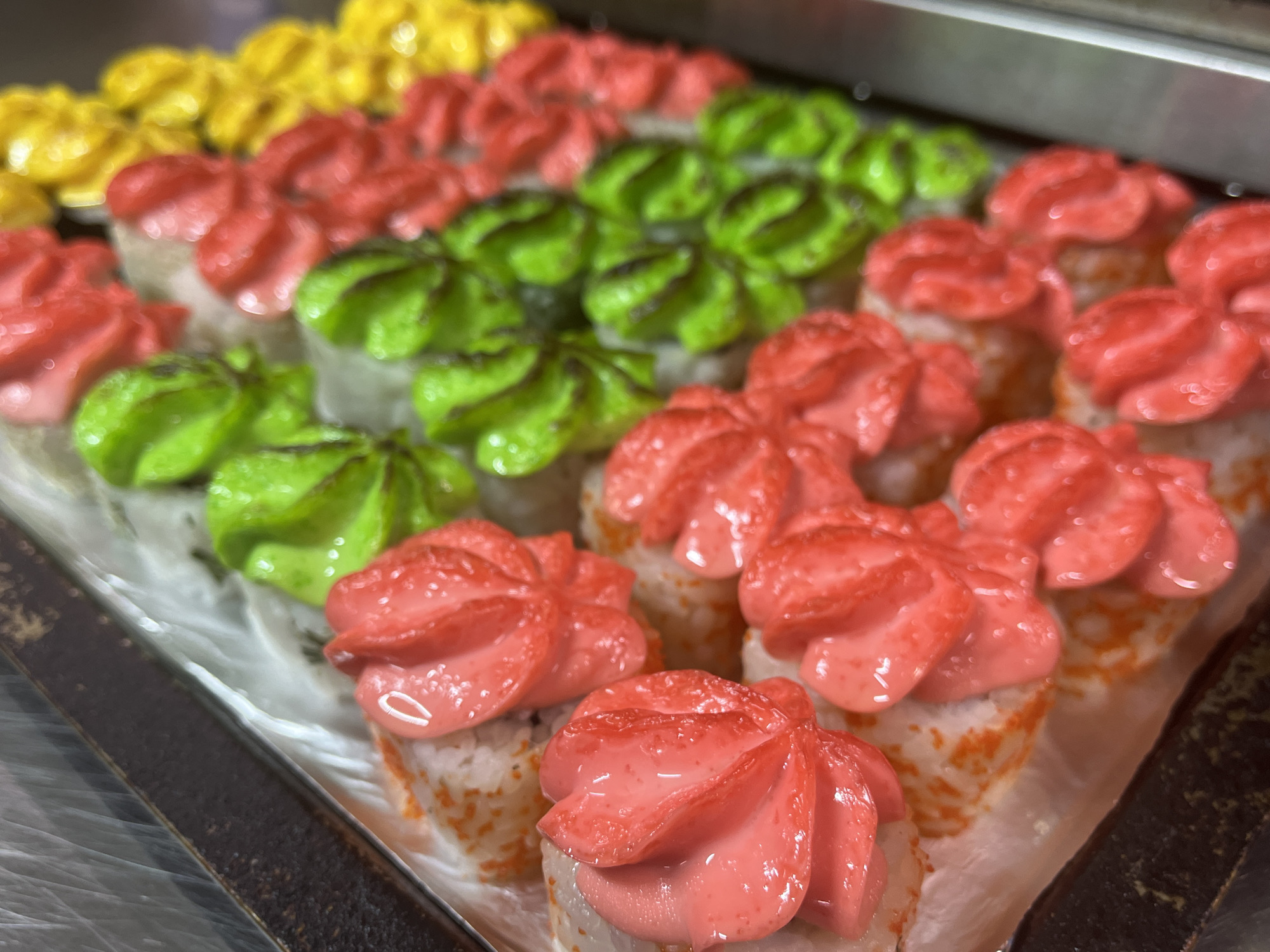 The image depicts a tray of sushi rolls, each topped with a rosette of colored cream cheese