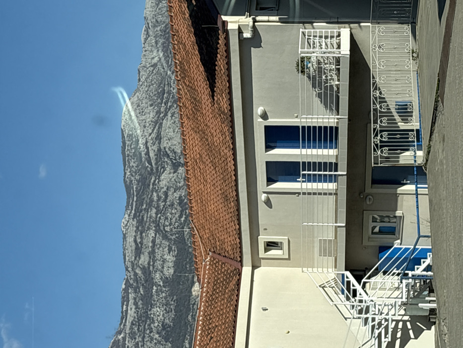 The image depicts a two-story building in Budva, Montenegro, set against a backdrop of rugged mountains under a clear blue sky. The building features light-colored stucco walls, with a cream tone on the left section and a lighter gray tone on the right. Its roof is covered with reddish-orange clay tiles. On the upper level, a balcony extends across the facade, enclosed by white horizontal metal railings. Two prominent blue double doors open onto this balcony. To the right on the balcony, a small white circular table with two matching chairs and a potted plant in a blue container are visible. Two white dome-shaped light fixtures are mounted on the wall above the blue doors. A small rectangular window is located on the left section of the upper wall. An external white metal staircase with blue risers descends from the left side of the building, casting distinct shadows. On the lower level, a small window with white framing and partially visible blue interior is present. A blue door is also visible, fronted by a white ornate metal gate with decorative scrollwork. Another section of similar white ornate metal railing defines a lower ground-level area to the right. A white drainpipe runs vertically along the right corner of the building. The background is dominated by large, craggy limestone mountains, appearing grayish-white with sparse dark vegetation, under a bright, clear blue sky. A faint, diffuse white streak, possibly a lens flare, is visible in the sky above the mountains. The foreground shows a dark, textured ground surface, likely paved. No individuals are present in the scene.