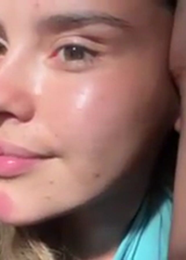 The video presents a close-up of a woman with light brown hair, fair skin, and brown eyes. She is looking off to the side, resting her head on her hand, and smiling. Her lips are glossy, and there is a slightly red area visible on her cheek. A light fixture is visible in the upper left corner, suggesting indoor lighting. In the background on the right, there appears to be a wall with stickers or decorations. The woman is wearing a light blue top.