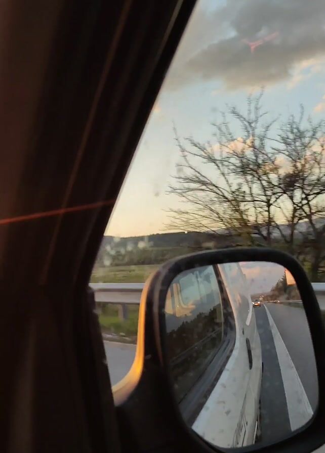 car driving on a highway at sunset. The side mirror reflects the car and the road behind it. The sun is setting in the distance, and the sky is filled with clouds. The car passes other cars on the road.