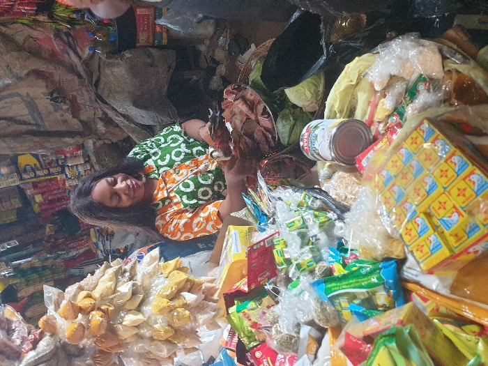 An indoor market stall in Nkpor, Nigeria, presents a female vendor engaged with her merchandise