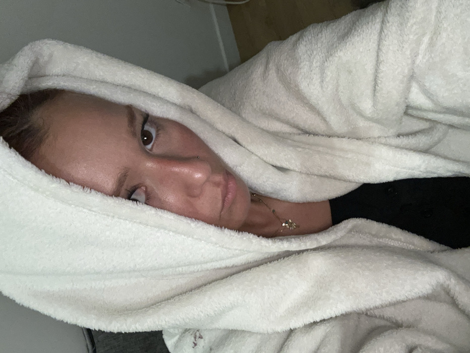 A single individual, identified as a female, is depicted in a medium close-up, gazing directly forward. Her head is mostly covered by the hood of a light-colored, plush robe, which appears off-white or cream in hue. Her reddish-brown hair is visible beneath the hood, framing her forehead. Her face displays a slight redness on the bridge of the nose and cheeks. Her eyes are dark brown, and her left nostril features a small, metallic piercing stud. Her lips are closed. Around her neck, a thin, gold-colored chain necklace is visible, from which a small, possibly star-shaped or ornate pendant hangs. Beneath the open robe, a dark, likely black, garment with visible buttons is worn. The background indicates an indoor environment. To the left, a portion of a grey, textured object, possibly upholstery, is visible. To the right, a plain, light-colored wall or vertical surface is present, with a subtle vertical line element. The bottom right shows a section of light-colored flooring. The scene is located in Puteaux, France.