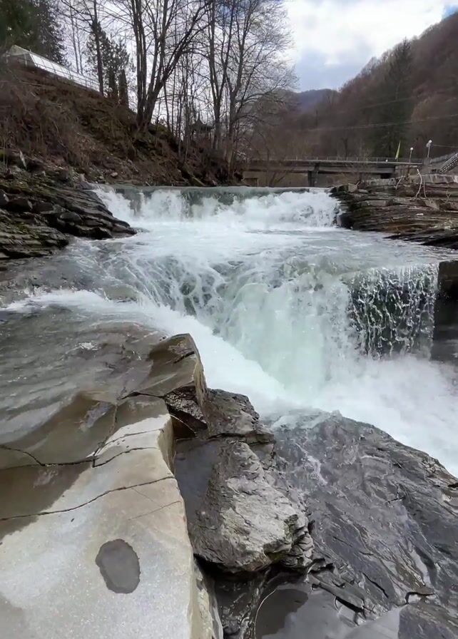 The video depicts a rocky stream with a series of small waterfalls. The water is white and foamy as it rushes over the rocks. Bare trees line the banks of the stream, and a bridge is visible in the background. The sky is partly cloudy. The camera moves slowly, capturing the flow of the water and the rugged landscape.