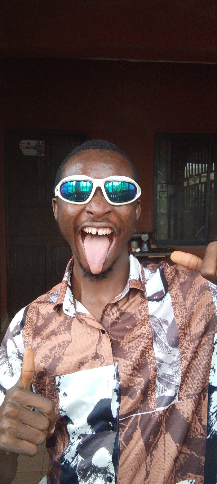 A dark-skinned man in sunglasses and a patterned shirt sticks out his tongue, gives a thumbs up. He's standing in front of a brown door and a window with bars. A counter with bottles and jars is visible behind him.