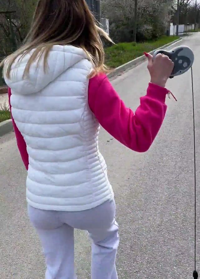 A woman walks a small, tan dog down an asphalt road marked with white lines. The woman wears white sneakers, light grey sweatpants, a pink sweatshirt, and a white hooded vest. The dog wears a small black jacket with pink faux-fur trim. The dog is on a leash. The woman holds the leash in her right hand. The woman and the dog are walking side by side. The wind blows the woman's hair. Trees and houses can be seen in the background. The dog barks.