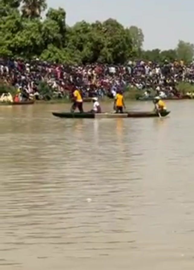 The scene captures a boat race taking place on a river or lake, with a large crowd gathered along the shore. The water appears somewhat murky or muddy, and the boat is a long, narrow canoe-like vessel with multiple people aboard. The people on the boat are actively using paddles or oars to propel it forward, likely in competition with other boats out of frame. The crowd on the shoreline is dense and stretches along the bank, suggesting a significant number of spectators are watching the event. The environment includes trees and vegetation along the shore, providing a backdrop for the scene, and the sky is overcast.