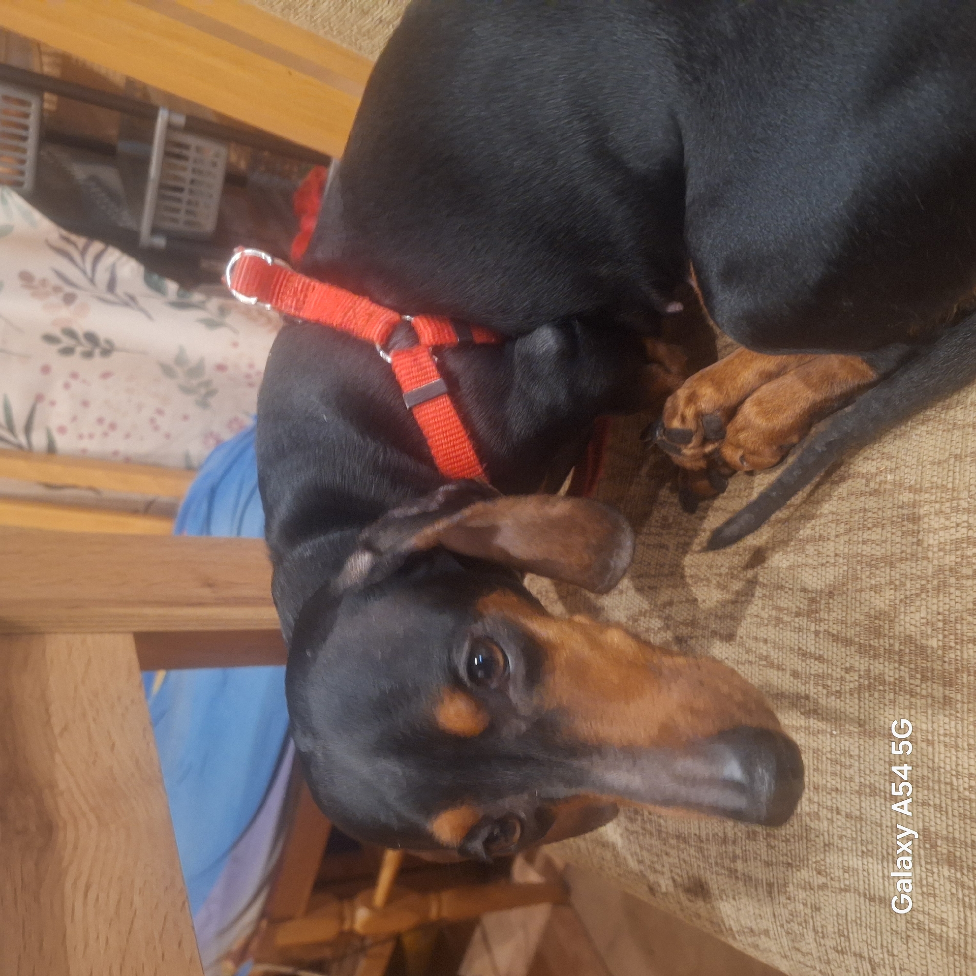 - "A black and tan dachshund is lying on a brown textured surface, likely a sofa or cushion" by FM-Ts3w63, licensed under CC BY 4.0