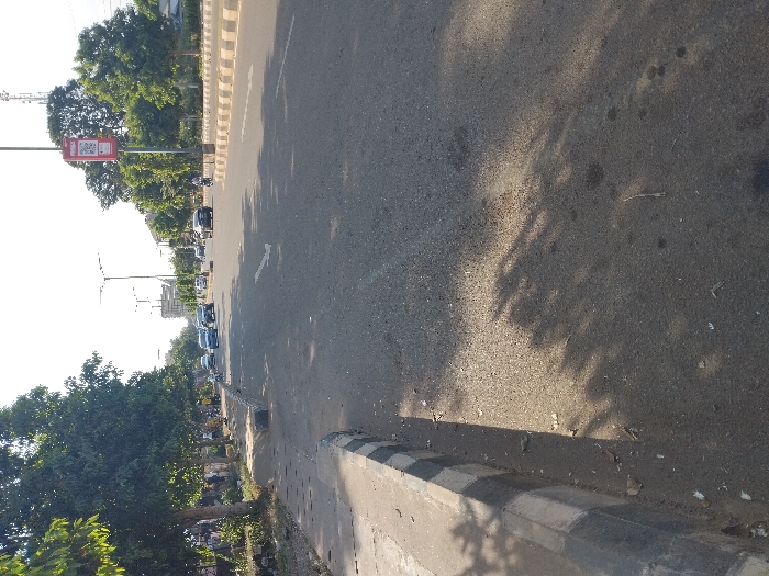 The image displays a multi-lane asphalt road in Shaba, Nigeria, captured during daylight hours under clear skies. On the immediate left, a concrete sidewalk with a black and white striped curb contains minor debris. Tree shadows are cast across the sidewalk and the adjacent road surface, which features a white directional arrow painted to indicate traffic flow away from the viewer. In the midground, approximately seven cars and one motorcycle are observed in motion on the asphalt lanes, proceeding in the direction of the arrow. The road is divided by a central concrete median marked with yellow and black striped paint. A red rectangular billboard, featuring a QR code, is mounted on a pole within this median. Rows of mature green trees line the left side of the road and the median. Faint human figures are discernible on the far left, positioned behind the roadside trees. Distant urban structures and additional vehicles are visible further down the thoroughfare.