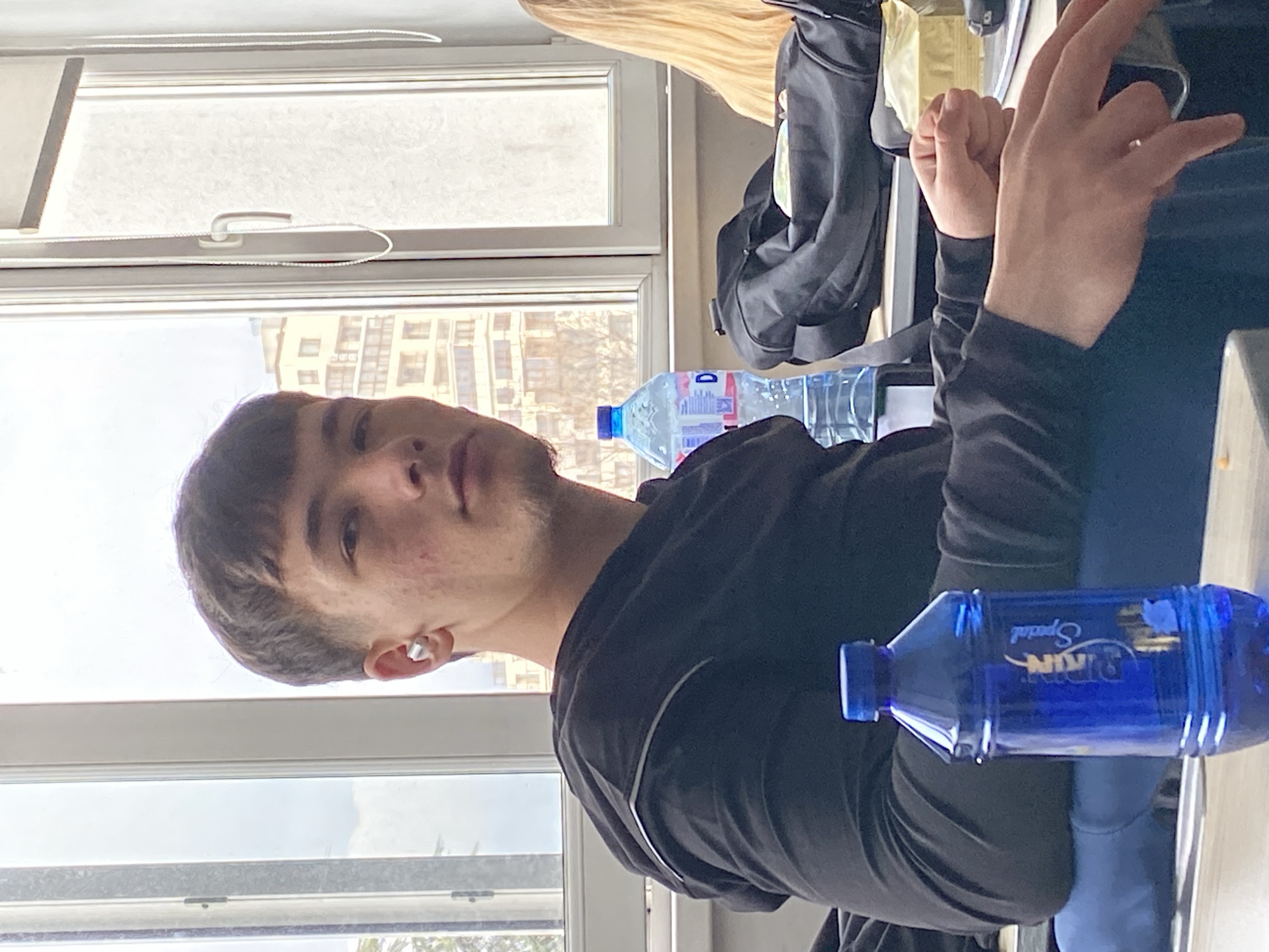 young man sitting indoors, seemingly at a table or desk. He has short dark hair and is wearing a dark long-sleeved shirt with light-colored accents near the shoulders. He appears to be in his late teens or early twenties. Behind him, there is a window with a white frame. Through the window, there is a cityscape with buildings visible, suggesting an urban environment. There are two water bottles on the table near him, one clear and one blue. A black backpack is also nearby. Based on the brand "KIN" on the blue water bottle, the location could be inferred as Varna, Bulgaria, where "KIN" is a locally available mineral water brand. The architectural style of the buildings visible through the window is consistent with urban buildings in Varna.