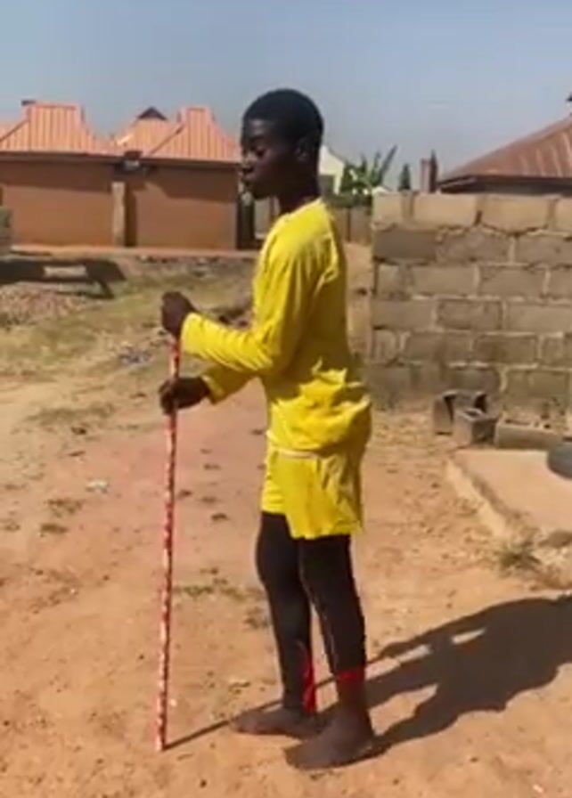 A young, dark-skinned man is walking and pretending to be a much older man. The man is standing in the middle of a dirt yard that is bordered by low brick walls and houses. He is wearing a yellow sports jersey with matching shorts, a black underlayer on his legs, and red socks. The man is holding a long, decorated stick with both hands and is hunching over as if he is using the stick as a walking cane. As he is walking in this position, the man is also pursing his lips as if he is whistling or talking to someone, but the sound is muted. The sky is blue with clear sunshine.