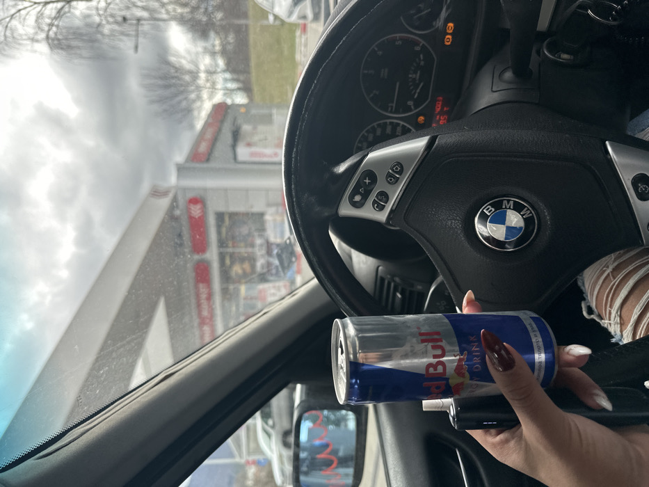 The image depicts an interior view from a vehicle, looking out through the windshield at a gas station on an overcast day. In the immediate foreground, a person's left hand, with manicured fingernails (some dark red, some white), holds an open silver and blue Red Bull energy drink can and a small black electronic device, possibly a vape pen. Part of the person's leg, clad in distressed light-wash jeans, is visible. The vehicle's steering wheel, bearing a BMW logo, occupies the lower right portion of the frame. The dashboard instrument cluster is visible behind the steering wheel, displaying a speed gauge, tachometer, and illuminated warning lights, including a digital reading of "95." A key is visible in the ignition. The windshield shows dust and smudges. Outside the vehicle, a Lukoil petrol station is visible. A white canopy covers the refueling area, under which a convenience store with large windows displaying various products is located. The store and canopy supports feature red accents and signage, including the Cyrillic word "МАРКЕТ" (Market). To the right of the convenience store, a separate structure, identified as a car wash, is partially visible. Bare trees and green ground are present in the background, with a hazy view of mountains in the far distance to the left. Another white car is parked to the left, and a dark-colored vehicle is partially visible to the right. The specific location is the Lukoil petrol station at 60 Cherni Vrah Blvd, Sofia, Bulgaria.