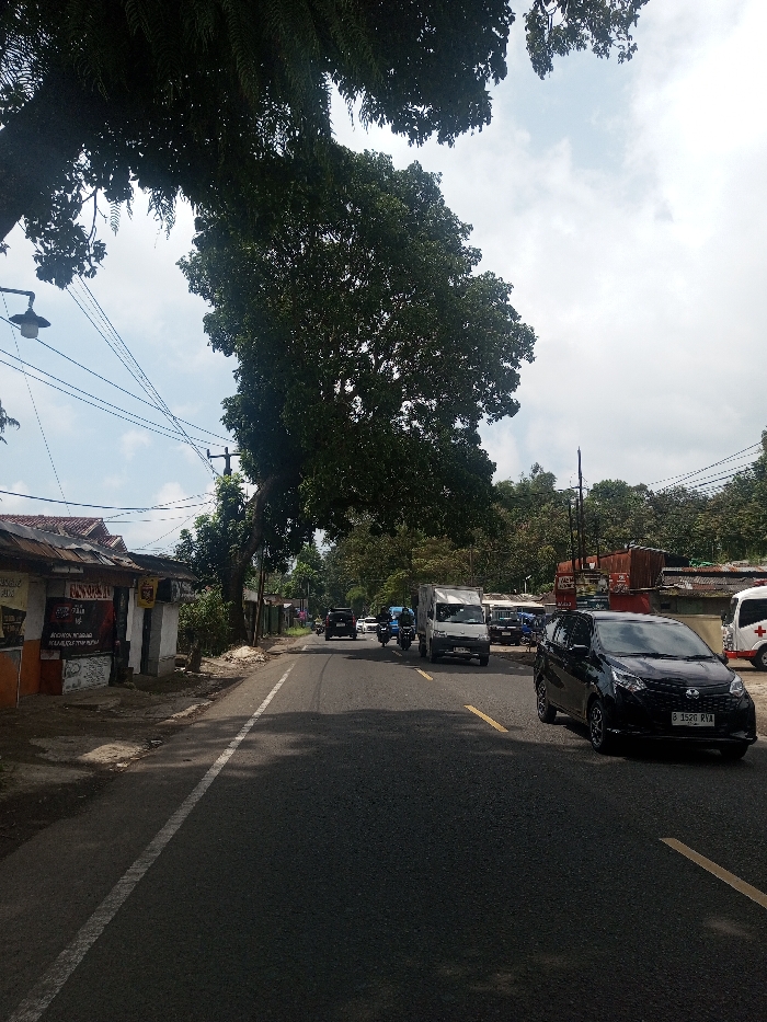 The image depicts a daytime street scene in the city of Niz Lakuk, India. A two-lane asphalt road with a solid white edge line and broken yellow center lines stretches into the background. Shadows from overhead foliage fall across the road. On the left side, a large tree with dark green leaves and ferns overhangs the foreground. A street light and multiple electrical wires are visible beneath the foliage. Along the road's left edge, rustic single-story buildings stand, one featuring a corrugated metal roof and signs on its facade. On the right side of the road, a black compact multi-purpose vehicle (MPV) with an Indonesian license plate "B 1520 RVA" is positioned in the foreground, facing away from the camera. Further down the road, a white box truck, a dark motorcycle, and another dark car are traveling in the same direction. An ambulance, white with a red cross emblem, is partially visible and stationary on the far right. Behind the ambulance, various structures with corrugated metal elements are present, backed by a dense line of green trees and foliage, suggesting a hilly terrain. The sky is partially cloudy with patches of blue visible. No individuals are distinctly identifiable.