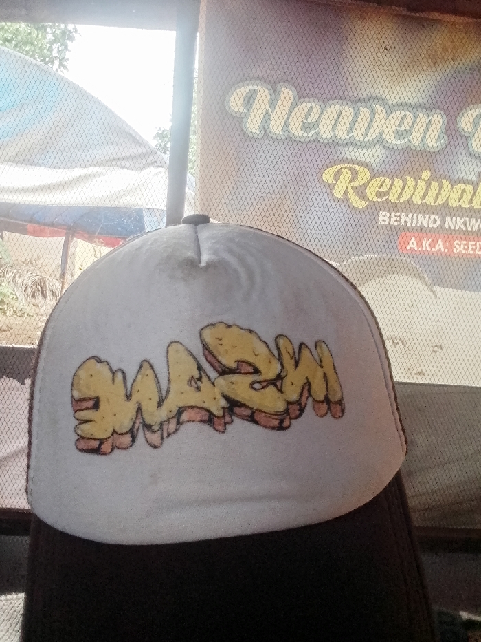 A white baseball cap with a dark brim, displaying the stylized yellow-and-orange bubble-letter text "MABZW," is centrally positioned in the foreground, obscuring the wearer or a stand. The cap's white fabric appears slightly soiled. The background is viewed through a dark, fine-mesh netting. To the right, a faded banner or sign is visible, bearing the light-colored script text "Heaven" and "Revival," with smaller text below reading "BEHIND NKW" and "A.K.A. SEED." To the left, an outdoor area is brightly illuminated, revealing a light-colored tarp or tent structure and blurred green foliage. The scene is outdoors or semi-enclosed, under bright lighting. The location is in the city of Unknown, Unknown.