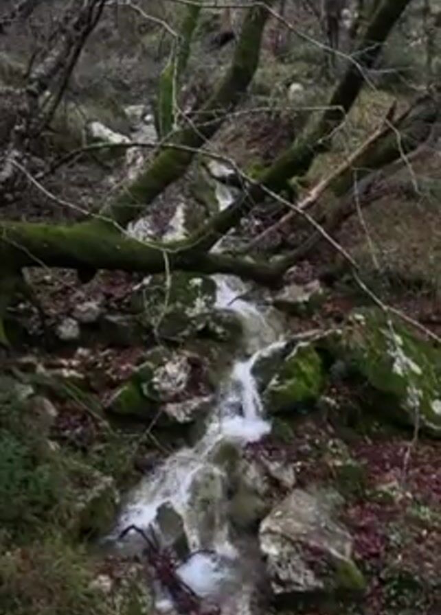 A stream cascades down a rocky, mossy slope in a forest. Bare tree branches, some covered with moss, frame the scene. The water is moving swiftly. The ground is covered with fallen leaves.