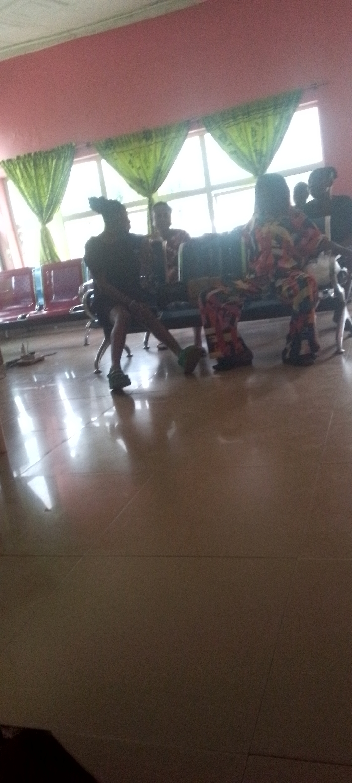 The image depicts an indoor scene in Adankolo, Nigeria, possibly a waiting area or common room