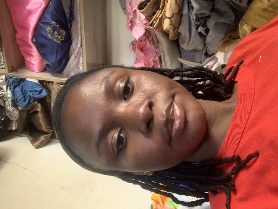 The scene is an indoor environment within the city of Arawa, Nigeria. An adult female with dark skin and dark dreadlocks is positioned centrally, looking directly at the camera with a neutral expression. She wears a red short-sleeved top. A small stud is visible in her right nostril, and a small, gold-toned, open-circle earring adorns her left ear. Her lips appear glossy. The background on the left features a portion of a colorful patterned fabric against a light-colored wall. To her right, a multi-tiered wooden shelving unit displays various folded fabrics and textile items of differing colors and patterns, including bright pink, dark blue with gold embellishments, brown, and gray.