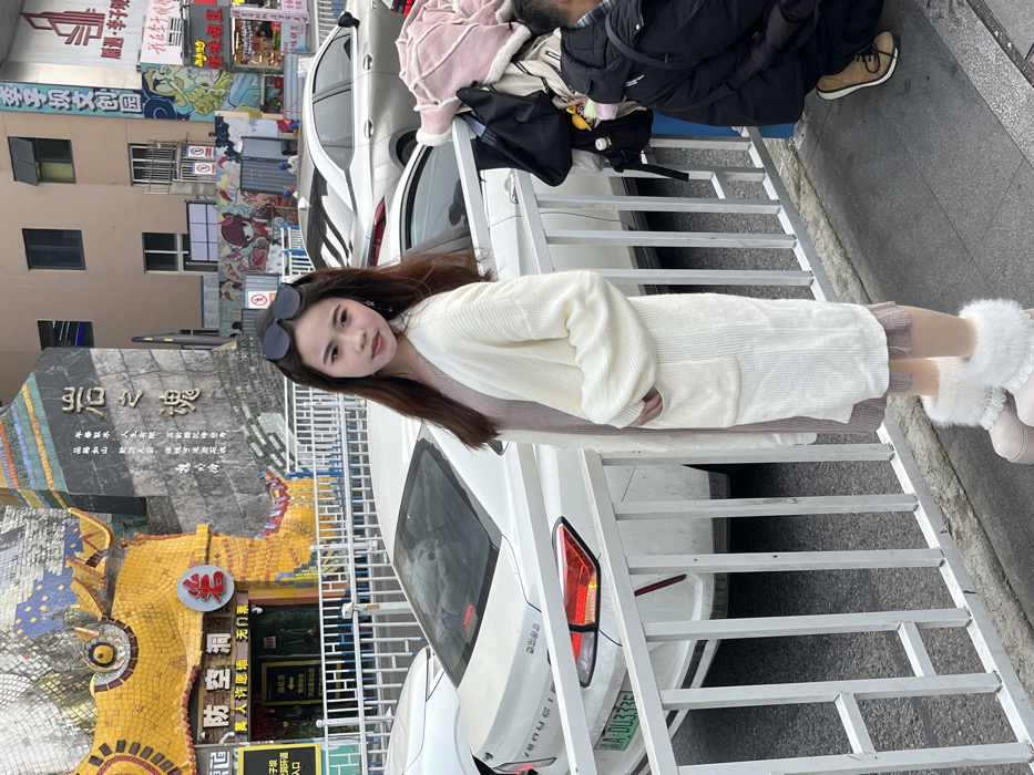 A young woman in sunglasses, a white cardigan, and furry boots poses in front of a white metal fence. Behind her are parked cars and a building with colorful signage. A large, partially obscured mosaic wall features Chinese characters and symbols, with visible text including "子圾," "三洞环道," and "萬人许愿墙无门票" along with a license plate.