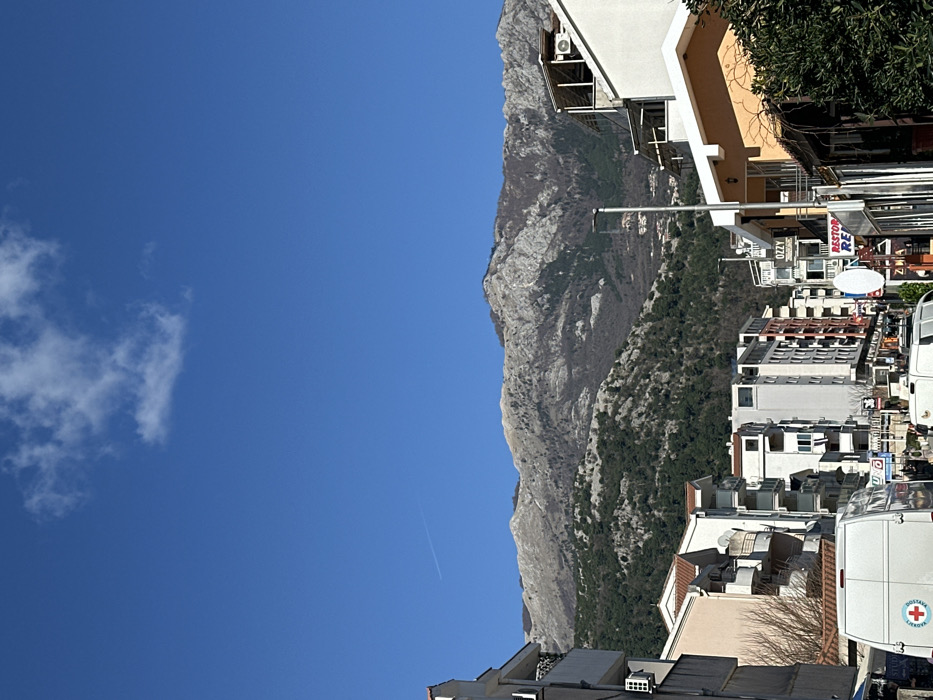 The image displays a daytime street scene in Budva, Montenegro, viewed towards a prominent mountain range