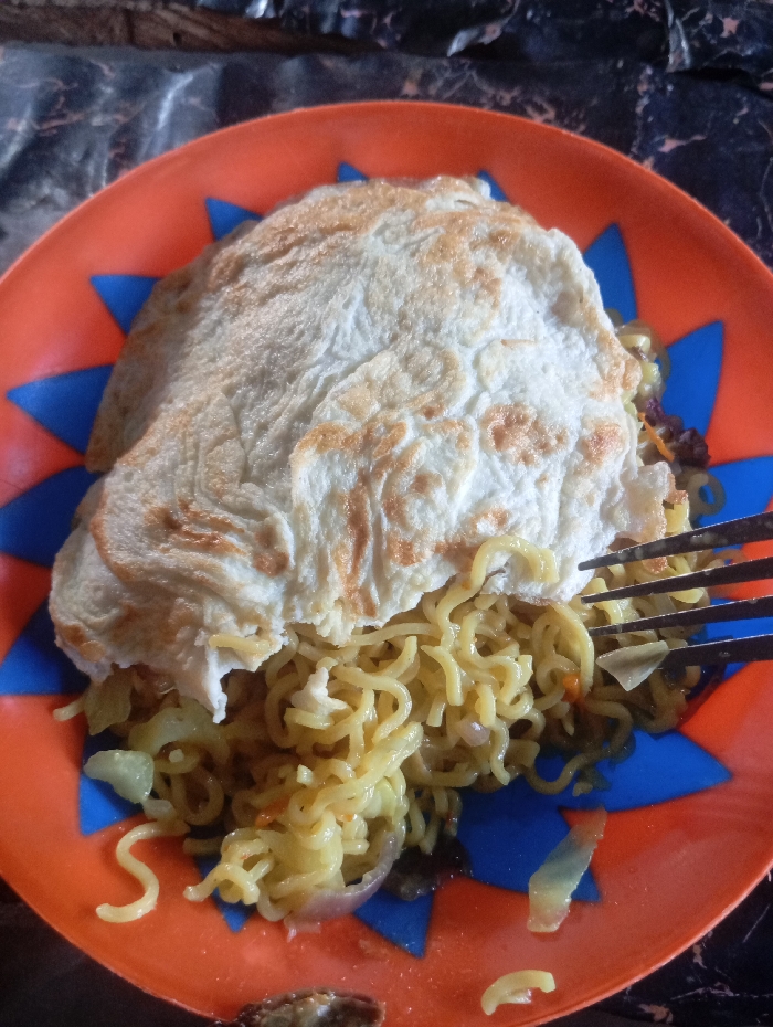 A close-up, overhead view depicts a meal served on an orange plastic plate accented with blue triangular patterns. The plate holds a serving of yellow instant noodles, mixed with visible pieces of chopped cabbage and red onion, beneath a large, lightly browned omelet or fried egg. A dark-colored, four-tined metal fork is inserted into the noodles and positioned under the egg on the right side of the plate, suggesting it is in use. The plate rests on a dark, textured surface, parts of which are covered by a reflective, possibly plastic sheet. No individuals are visible. The setting appears to be an indoor, casual dining environment. The specific location within DU, Nigeria, cannot be visually confirmed from the image; however, the meal is consistent with common quick meals or street food found in the region.