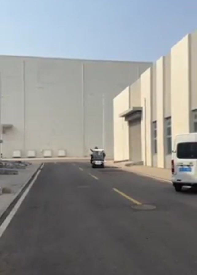 The scene shows a golf cart driving down a road with a person waving from inside it. The background shows an industrial area with large buildings. A white van is parked on the right side of the road. The day appears to be sunny and the sky is clear.