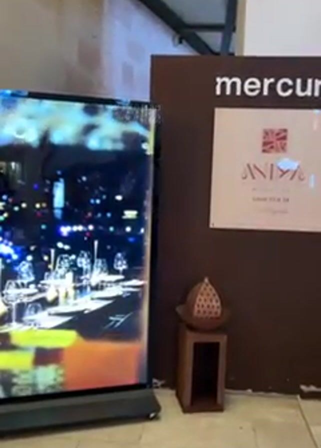 n interior hallway with a screen displaying images of a restaurant. A sign next to it says "mercury" with the word "ANTINA" and "Level 33 & 34". There are two small wooden stools with decorative objects. The camera moves to show a modern building exterior with outdoor seating and lights. People are walking around, and there are trees and other greenery.
