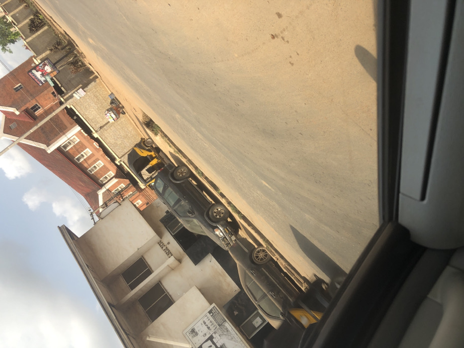 This image presents a tilted street-level view in Umuokpu, Nigeria, under a partly cloudy daytime sky. The photograph was taken from inside a vehicle, evidenced by the dark gray car door panel visible along the bottom right edge. A light brown, possibly dirt or poorly paved, road occupies the foreground and center, with distinct shadows indicating sunlight from the upper right. Along the left side of the road, a dirt shoulder hosts several parked vehicles: a dark-colored sedan with light-colored multi-spoke wheels is closest to the viewer, followed by a black SUV, and then a yellow and black tricycle (Keke Napep) with a black canopy. Further down the road, a small, wheeled cart or stall is visible. To the left, a two-story building with a light-colored, possibly stucco, facade features multiple rectangular windows with screens and a dark-colored lower section, possibly an entrance or garage. A white sign with dark text and graphics is partially affixed to its front. In the background, on the right side of the street, a large red-roofed building with white-framed windows is prominent, enclosed by a stone or concrete fence. A tall utility pole stands near this fence, and a vertical billboard displaying an advertisement with what appears to be a person's face and text is positioned behind the fence. No individuals are discernible within the scene.