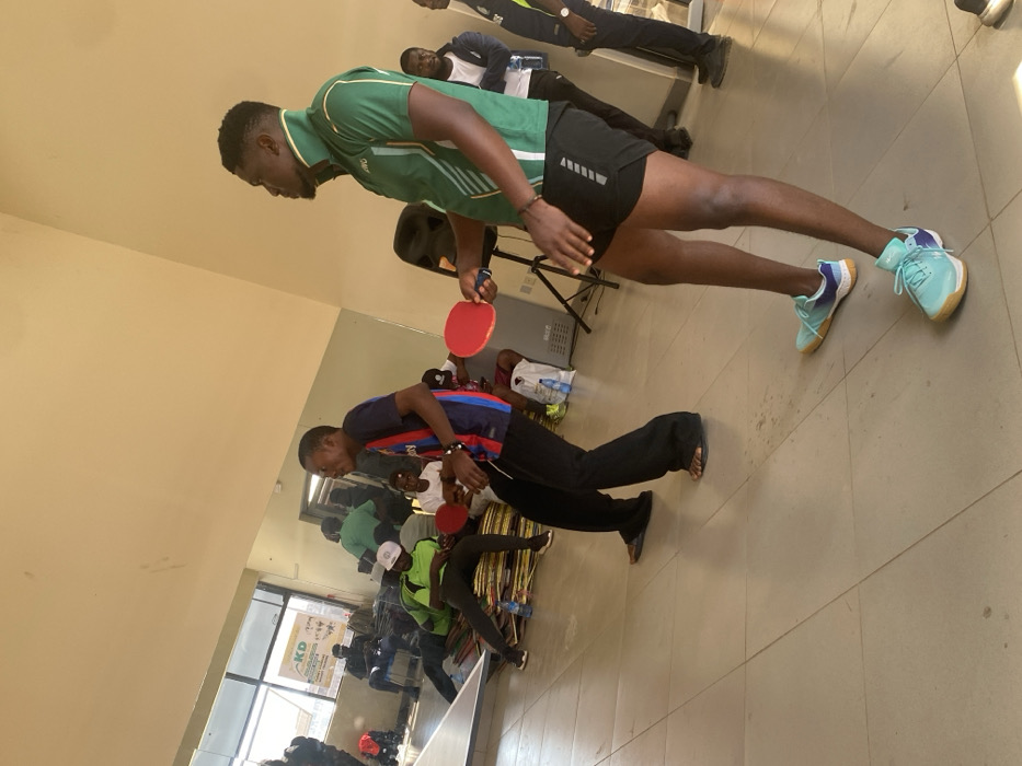 The image captures an indoor scene in Unguwar Sarki, Nigeria, featuring a light-tiled floor and plain walls, illuminated by natural light from a large window on the left. In the foreground, two men are positioned in ready stances for table tennis. The man on the right, with dark skin, wears a green and white collared sports shirt with "UWC" visible on the chest, black shorts, and light blue and white athletic shoes. He holds a red table tennis paddle in his right hand. To his left, another dark-skinned man wears a blue, red, and black striped shirt, black pants, and dark flip-flops, holding a red table tennis paddle in each hand. The edge of a white table tennis table is partially visible on the far left. In the mid-ground and background, approximately six additional individuals, all appearing male, are present. Some are seated near the window, with a banner displaying "KD" visible behind them. Others are standing to the right, observing the activity. A large mirror on the back wall reflects portions of the room and the people within it. A black speaker on a tripod stand and a white water dispenser are visible in the background. Stacked items, possibly rolled mats or posters, are on the floor near the window.