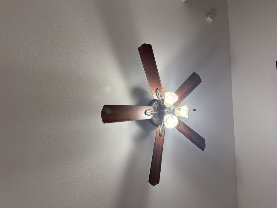 - "A ceiling-mounted, five-blade fan with dark wood-finish blades and a dark metallic housing is centrally positioned against a light-colored, textured ceiling" by FM-XFP9p2, licensed under CC BY 4.0