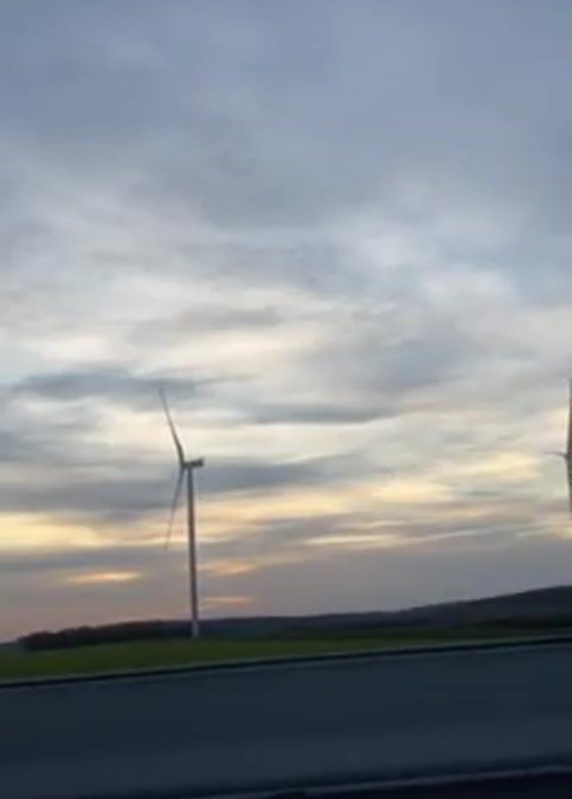 view from a moving vehicle, likely on a highway or divided road. The sky is overcast with the sun low on the horizon, creating a soft sunset effect. Two wind turbines are visible in a field adjacent to the road. A silver car passes on the road, moving in the same direction as the camera. The scene is generally calm and rural.