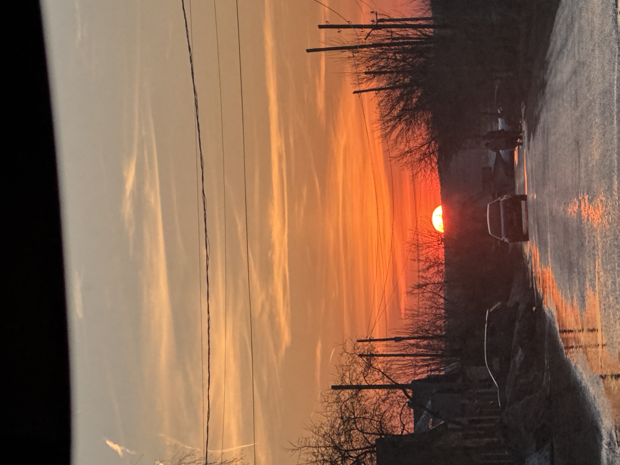 Captured from within a vehicle, the image presents a vibrant sunset illuminating a streetscape in what is likely Chaikovsky, Russia, given the request. The setting sun, partially obscured by barren trees, casts an orange glow across the sky, creating a striking contrast with the silhouettes of utility poles and overhead wires. A wet asphalt road reflects the fiery colors, mirroring the sunset and adding depth to the scene. A vehicle, possibly in motion, is visible on the road. The overall atmosphere suggests either the end of the day or the onset of twilight in a residential area.