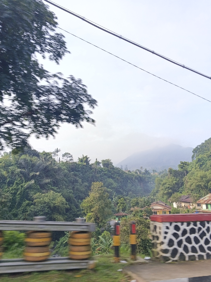 The image depicts a mountainous, densely vegetated landscape, likely viewed from a road or elevated position in the city of Unknown, Cambodia
